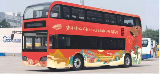 儀式在大禹陵舉行,描繪大禹陵的巴士格外令人矚目,車身涂裝選取了大禹銅像、享殿、大禹陵碑等景區(qū)標(biāo)志性建筑進(jìn)行藝術(shù)化加工,并在車尾以水元素作為點(diǎn)綴,烘托出大禹治水英雄的偉大形象。整體外觀設(shè)計(jì)簡(jiǎn)約流暢,色調(diào)明麗,時(shí)尚大方,又不失古典韻味。
