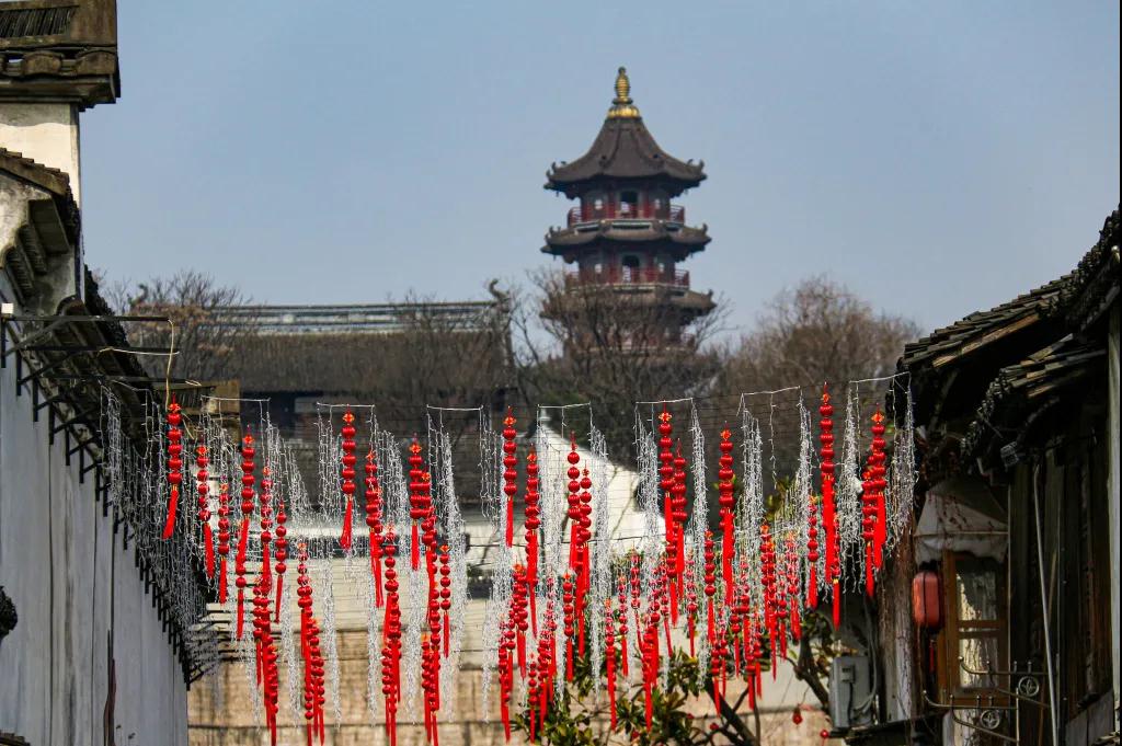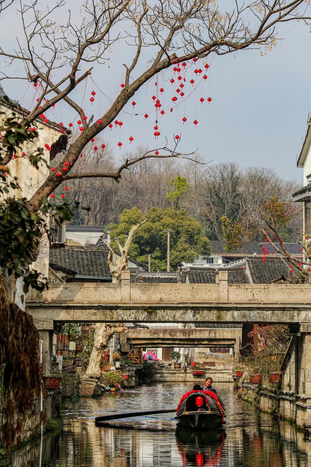 樹上燈紅如“柿”,唱響新春序曲;橋下波光粼粼,映出新年紅彩。一葉烏篷,搖曳在碧水之上、藍(lán)天之下、老街之中。一抹江南春意,一抹燈彩年色。