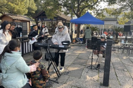 昨天下午,魯迅故里景區(qū)東門口廣場(chǎng)熱鬧非凡,網(wǎng)紅烏氈帽樂隊(duì)在這里動(dòng)感開唱,吸引了眾多游客們駐步觀看?!秷?zhí)迷不悟》、《那些你很冒險(xiǎn)的夢(mèng)》、《天天咸咸》……樂隊(duì)演唱了多首大眾耳熟能詳?shù)牧餍芯W(wǎng)絡(luò)歌曲,為魯迅故里景區(qū)帶來(lái)流行的時(shí)尚氣息,為紹興的冬天帶來(lái)一絲暖意。