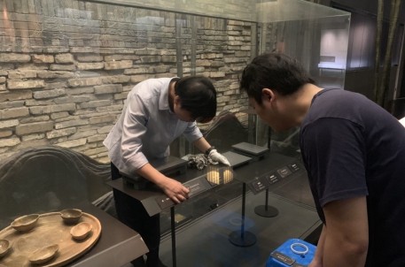為使清潔工作更加順利、高效,工作人員進行了分工合作,有套上鞋套、拿著清潔工具進入展柜中清潔的,有負責引導的。由于空間狹小,工作人員先將展品移出展柜,在對展柜玻璃進行清潔的同時也對展面與展臺進行打掃。這一過程中,總會有沒有清潔到的地方或死角,站在展柜外的人員就及時對里面的人進行提醒與引導,使清潔工作進行地更加全面與徹底。完成展柜玻璃及展臺的除塵清理工作后,工作人員還對個別展品的小標簽進行了更換調整,以使標簽樣式統(tǒng)一、美觀。