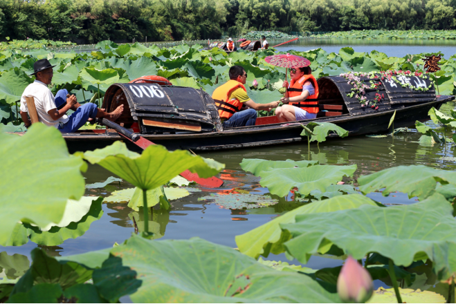 烏篷劃進(jìn)荷塘,碧綠的蓮葉隨著行船和微風(fēng)涌動,散發(fā)出陣陣清香,將絲絲暑氣消散。端午期間,凡乘坐會稽烏篷拍攝荷花視頻上傳至抖音平臺并集齊18個贊,即可至烏篷船內(nèi)碼頭領(lǐng)取香囊一個。