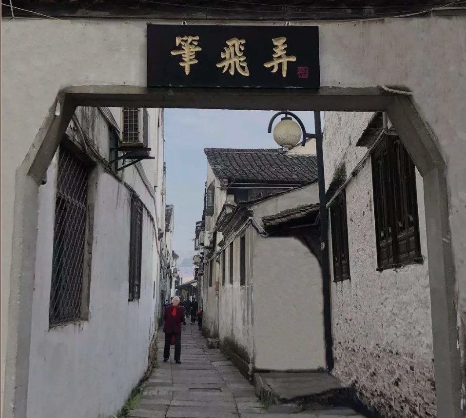 有一富商為得到王羲之的書法,買通羲之鄰居,鄰居抱大白鵝終求得書法。富商取字時(shí),被羲之碰見,氣惱之下將筆擲于桌上,此筆竟彈了起來,穿過紙窗飛過弄堂,便有了“筆飛弄”一名。