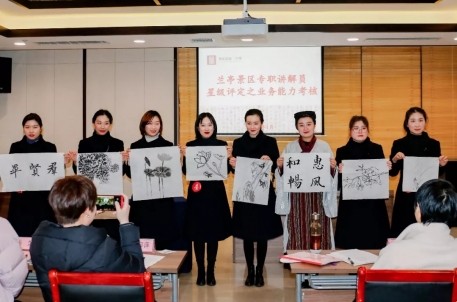 2019年1月17日下午,蘭亭景區(qū)講解員年終考評(píng)在書法博物館培訓(xùn)室進(jìn)行。本次年終考核與以往有所不同,要求講解員上一堂“蘭亭研學(xué)游課程”,完成不少于10分鐘的講解內(nèi)容,力求做到生動(dòng)、形象、科學(xué)、互動(dòng)。