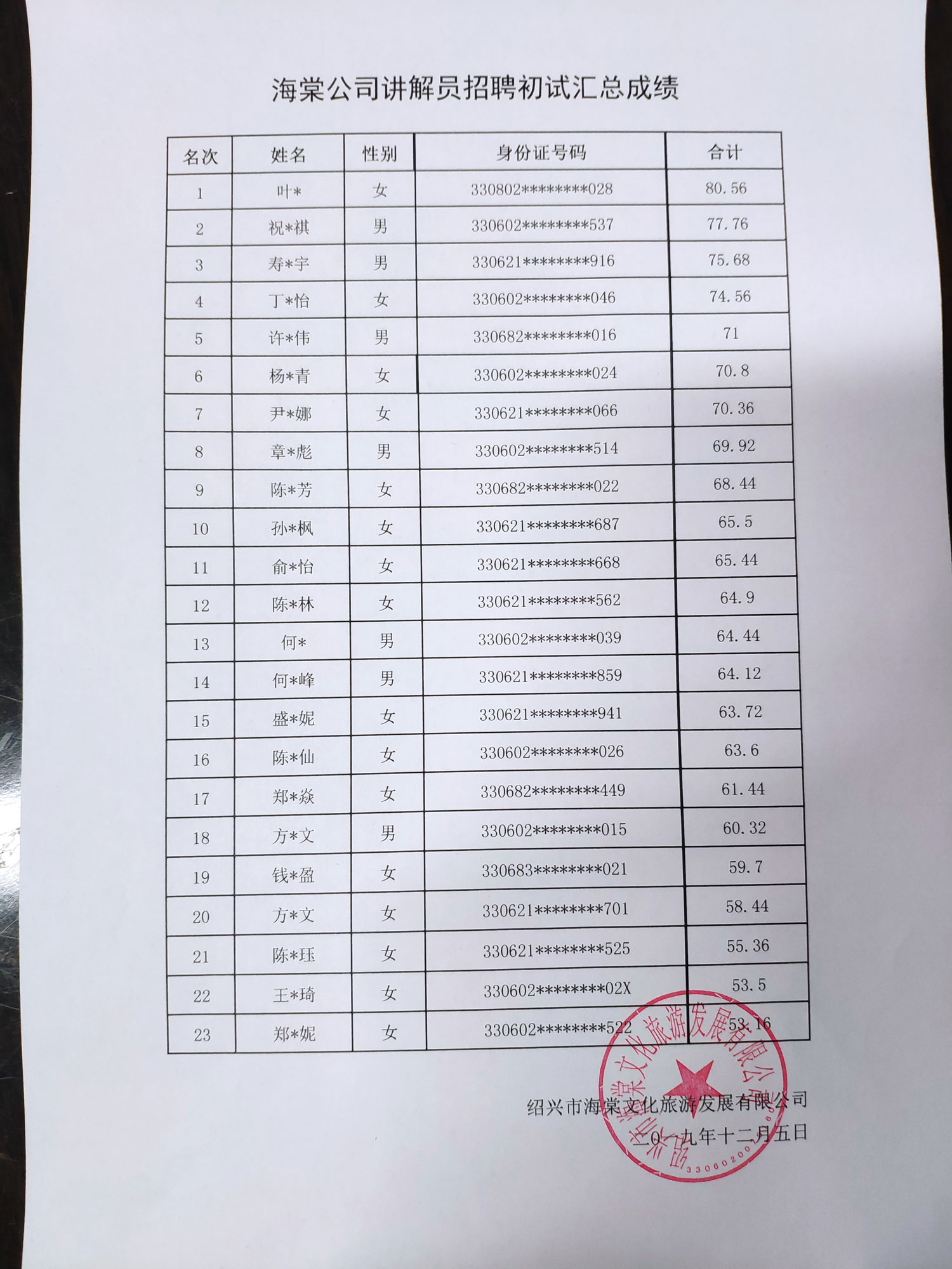根據(jù)講解員初試情況,經(jīng)研究決定,初試總成績前12名人員入圍復(fù)試,復(fù)試時間、地點另行通知。