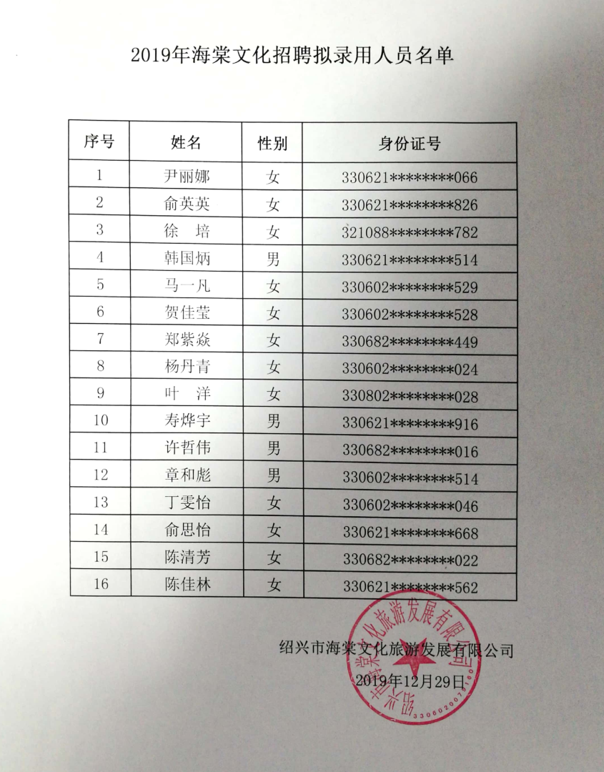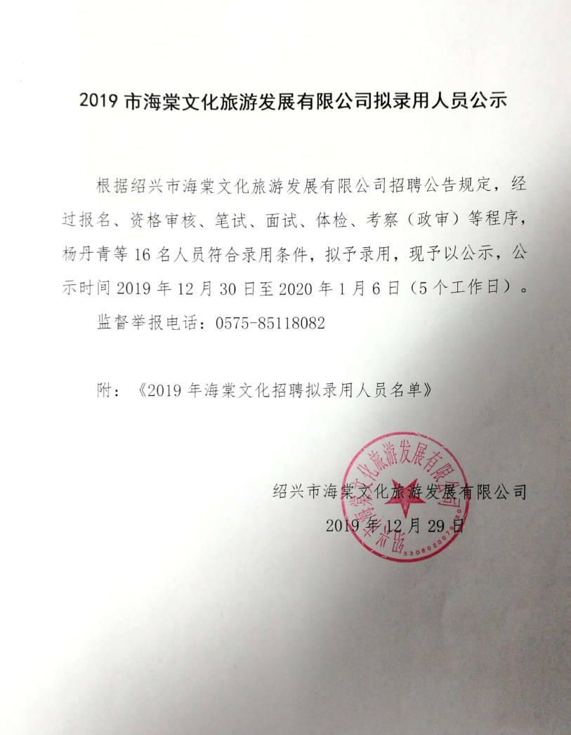 2019市海棠文化旅游發(fā)展有限公司擬錄用人員公示
