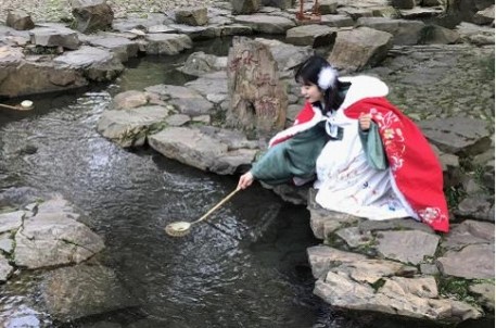 12月底,在蘭亭景區(qū)曲水流觴景點處,隨著盛滿紹興美酒的觴杯隨著之字形的曲水蜿蜒而下,“抖IN”網(wǎng)紅大咖和身著漢服的古代美人兒以善于發(fā)現(xiàn)美的眼光和善于記錄美的鏡頭,完成了在蘭亭景區(qū)的直播宣傳活動。