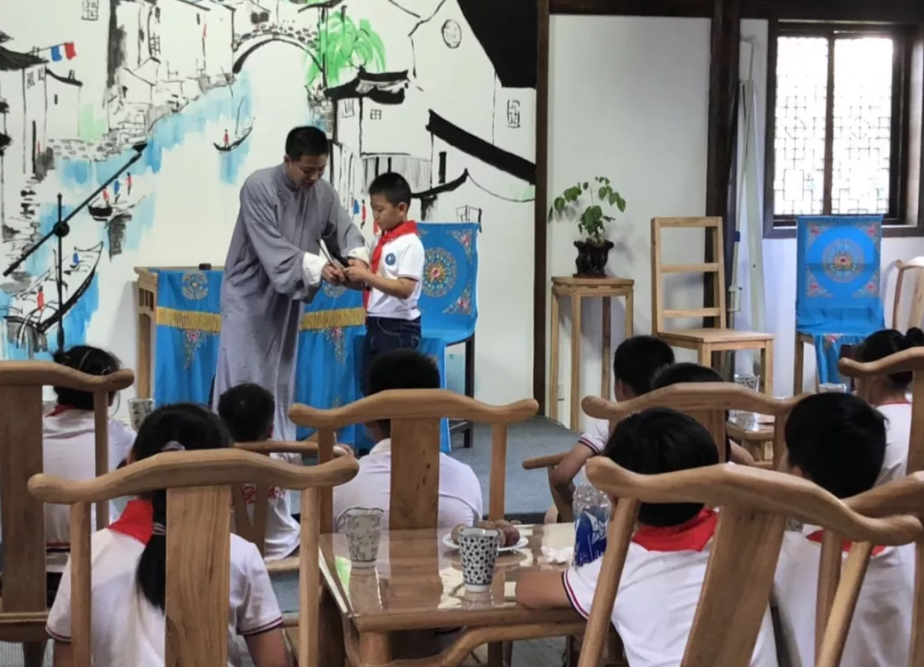 以曲藝優(yōu)勢、平安書場、民間故事為抓手,以紹興蓮花落為切入點,介紹紹興各大曲種知識,同時進行現場傳唱,教授經典唱段,體驗敲打三翹板等活躍課堂氣氛,培養(yǎng)學生說唱、表演能力。