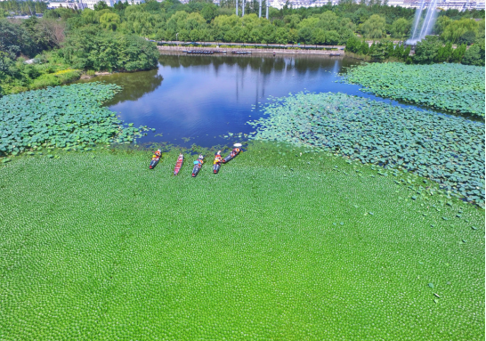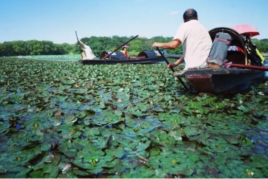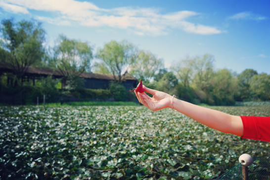 南鎮(zhèn)紅菱池中,早已有大片大片的菱葉一圈圈地鋪開, 映綠了半片池水。乘坐烏篷緩緩進入其中,便可看到?jīng)]于葉下的顆顆紅菱,嬌羞可人。掬一把稽山水,采一捧鮮紅菱,收獲的就是那“天涼好個秋”了。