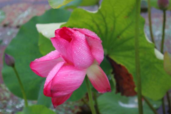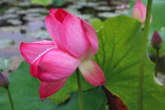 烏篷劃進(jìn)荷塘,周遭不少荷花已是亭亭玉立,展顏而笑。霏霏雨露,泫然欲滴;盈盈水珠,沾荷欲濕。在江南那蒙蒙煙雨的映襯下,荷花、荷葉更顯其清秀娉婷。