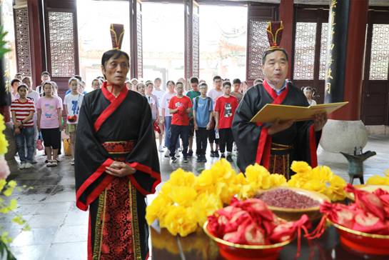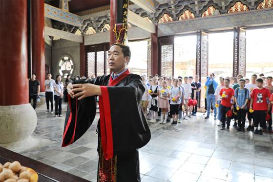 大殿里,大家有秩序地排好隊,稚嫩的小臉上寫滿了莊重與敬意,共同參與一場傳統(tǒng)的祭禹儀式。