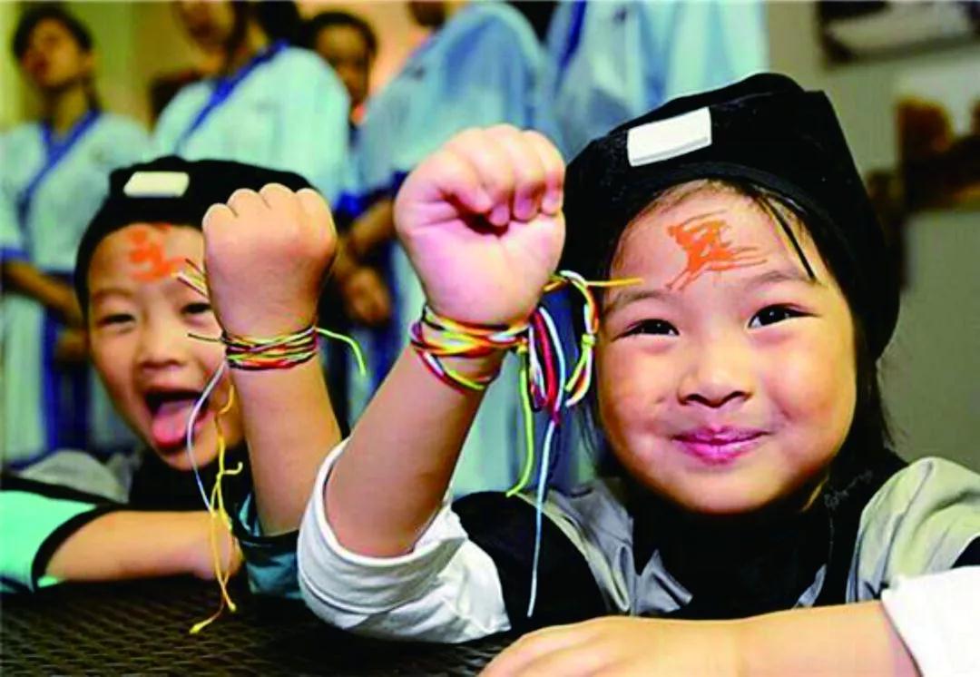 五色絲線是端午節(jié)傳統(tǒng)之俗,用紅綠黃白黑色粗絲線搓成彩色線繩,系在手臂或頸項(xiàng)上。