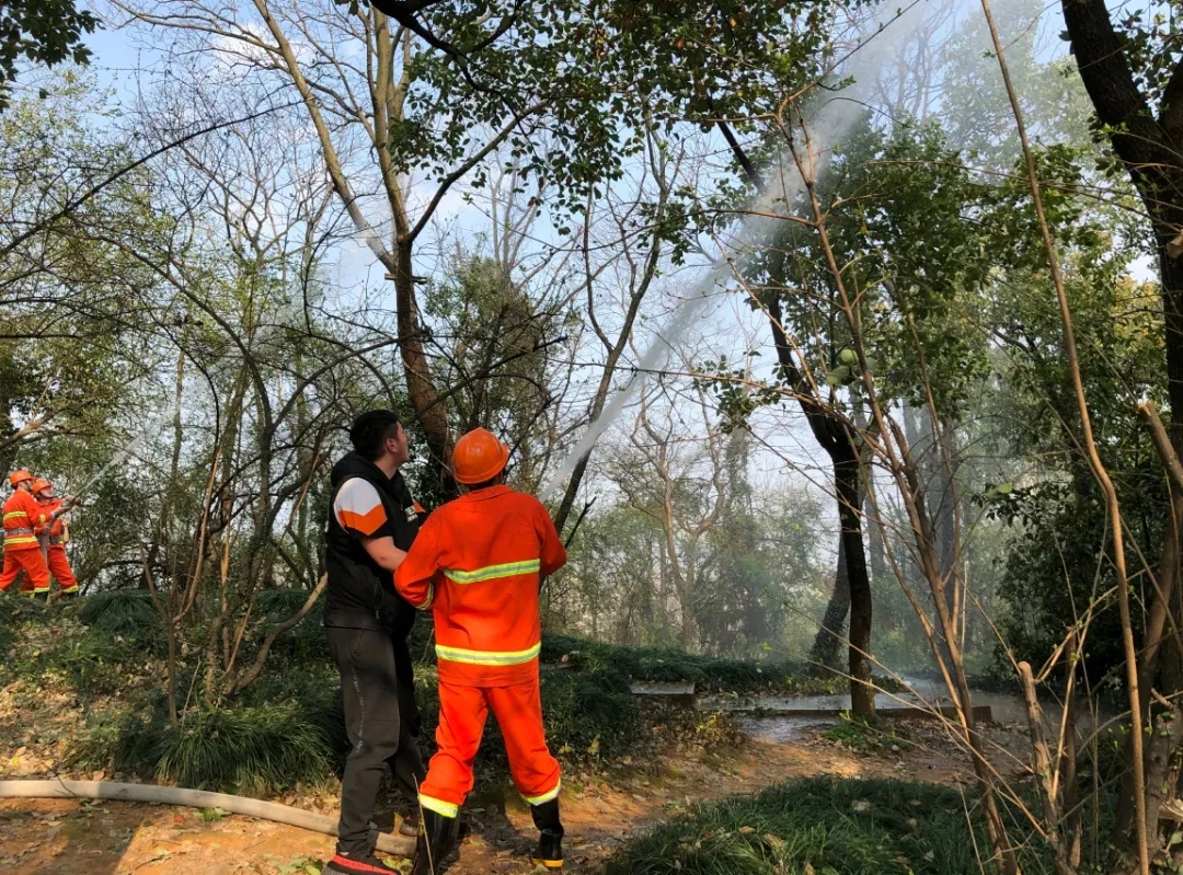 對(duì)周?chē)鷺?shù)木進(jìn)行澆濕,從火源邊緣向中心點(diǎn)滅火,防止火情蔓延,最大限度的減少火災(zāi)損失。