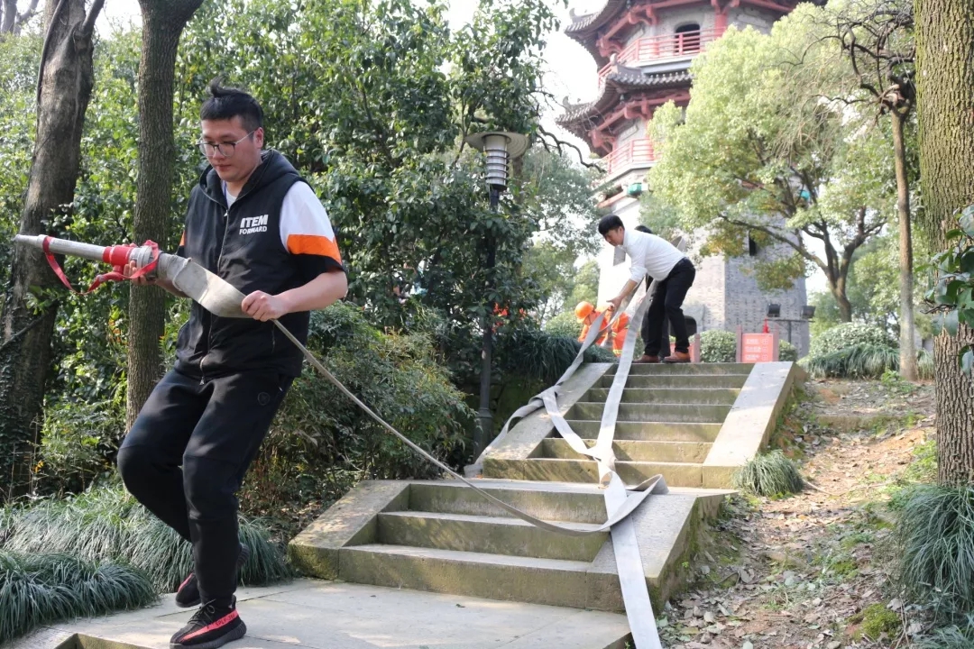 滅火組成員分別趕到文筆塔附近消防栓的各個(gè)位置上,打開(kāi)消防栓蓋,連接好水帶槍頭迅速奔赴火災(zāi)現(xiàn)場(chǎng)。