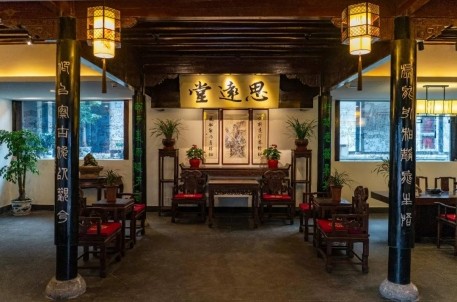 走進(jìn)酒店大堂,第一個(gè)映入眼簾的就是正上方懸掛的“思遠(yuǎn)堂”大匾。前后兩側(cè)對(duì)聯(lián)分別為“虛能引和靜能生悟,仰以察古俯以觀今”和“持其志勿暴其氣,敏於事而慎於言”。再現(xiàn)了古城臺(tái)門人家的廳堂風(fēng)貌和文化氛圍。