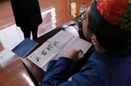 既然來到書法圣地紹興,怎能不學(xué)習(xí)寫大字呢?在私塾先生的指導(dǎo)下,代表團(tuán)一行人手握毛筆,橫平豎直地寫著中國漢字。一位代表團(tuán)成員更是學(xué)著手機(jī)上的漢字,有模有樣地“畫”下了“我愛紹興”這幾個(gè)大字。