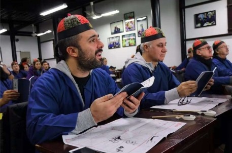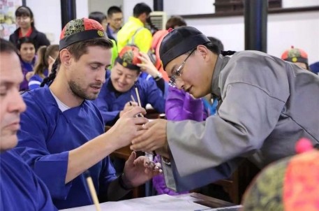 私塾課堂上,代表團(tuán)一行人在工作人員的幫助下穿上長衫,帶上瓜皮帽,跟著私塾先生搖頭晃腦地念著《三字經(jīng)》:“人之初,性本善……”雖然中文很拗口,但是大家都學(xué)得津津有味。