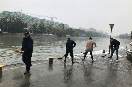 一大早,同志們冒著惡劣的天氣,來到環(huán)城河各大公園、游船碼頭、道路兩邊等進行掃雪除冰。他們不畏嚴寒,在持續(xù)降雪過程中,破冰、鏟冰,掃雪、清路面、掃臺階,個個干勁十足,一派熱火朝天的景象。他們有的拿著掃把奮力掃雪,有的拿著鐵鏟賣力鏟雪,有的拿著竹竿敲打樹上、屋檐上、長廊上的積雪。雖然雪一直在下,大家卻都干得熱火朝天;雖然天氣寒冷,凍得手臉通紅,但誰也沒說一句累,沒喊一聲苦。在碼頭易滑到的地方,還墊上了防滑地墊,防止路人滑倒。半天下來,積雪和路面也基本清掃完畢,還原了道路的本色。寒冷的天氣擋不住大家的熱忱,鏟冰除雪的身影成為了一道獨特的風景,過往市民紛紛停下腳步,為這掃雪大軍“點贊”。