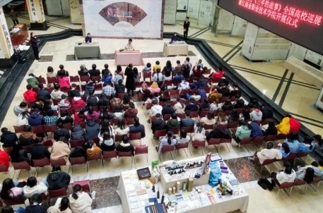 此次巡展依然采取“互聯(lián)網(wǎng)+展覽+文創(chuàng)+講座”模式,文創(chuàng)展區(qū)吸引了眾多學生的參觀、光顧;5日傍晚由喻館長主講的《王羲之的書法味與人情味》講座也在學校的報告廳開講。