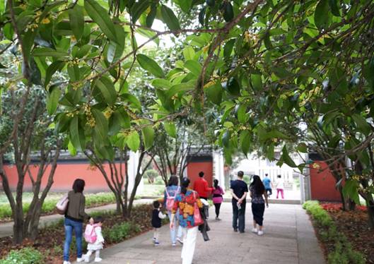 走在桂樹下,零星飄落的桂花,粘在衣服上、發(fā)絲上,香味若隱若現(xiàn),隨著游人一路走遠。