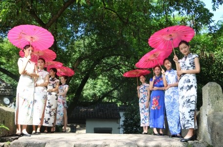 此時(shí),身穿旗袍、手拿油紙傘、團(tuán)扇的16位婀娜多姿的越女,正在龍門橋、寶珠橋展示精彩的旗袍走秀。精美的裝扮、優(yōu)雅的身段、古典的氣質(zhì)與環(huán)山河的小橋流水、水鄉(xiāng)美景融合為一體,此情此景,讓攝影師、游客們紛紛拿起相機(jī)和手機(jī)定格這美麗的瞬間。