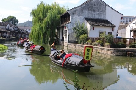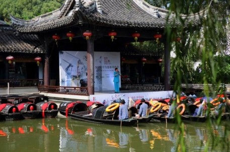 隨后,在貨郎船的帶領(lǐng)下,越女水上大巡游正式開始,水城美船娘舉起杯中酒向各位賓客送去祝福,越女們?cè)跒跖翊媳M情地展示著旗袍之美,讓游客們感受了一場(chǎng)旗袍秀盛宴。同程網(wǎng)四位網(wǎng)紅與游客們一起坐著烏篷船品黃酒,看社戲,一路隨著越女巡游,還拍攝并制作了精彩的抖音。