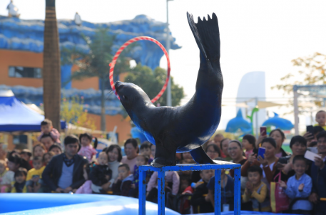 10月底的某一個周末,在閉園已久的紹興夢幻水世界迎來了一位新朋友。這個新朋友黑黑圓圓,卻也迅猛靈活。原來是1歲多的海獅小朋友來表演了,受到了非常多紹興小朋友們的熱烈歡迎。它隨著飼養(yǎng)員的口令,一會兒頭上頂球,一會兒轉(zhuǎn)呼啦圈,一會兒原地打滾,一會兒又嗖的一下鉆進了水里,沾濕了身體,再晃上岸。隨著一個個精彩的動作逐一展示,人群中也爆發(fā)陣陣熱烈的掌聲。回頭再看這位新朋友,竟然站在舞臺上自己揮舞拍打著巴掌呢。