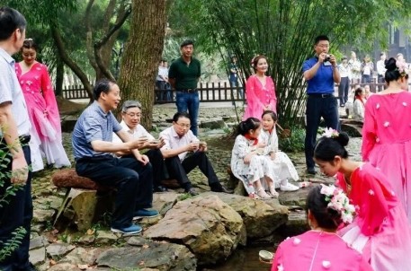 九月,正值開學(xué)季。景區(qū)內(nèi)剛好有百余位學(xué)生在參加開學(xué)禮。描紅、拓碑、曲水流觴、活字印刷、開筆禮等活動(dòng),內(nèi)容豐富,現(xiàn)場(chǎng)氛圍有序良好。部長充分肯定了景區(qū)這一“文化+旅游”高度融合的舉措,并和同學(xué)們親切交談,關(guān)心關(guān)懷同學(xué)們的學(xué)習(xí)、生活。在文創(chuàng)展區(qū),蘭亭景區(qū)主任湯曉蕾向部長介紹了“蘭亭的故事”自營品牌的一系列情況。近千款文創(chuàng)產(chǎn)品,都抒寫著和蘭亭有關(guān)的故事,品牌特色十分凸顯。而剛剛喜獲2018中國特色旅游商品大賽銀獎(jiǎng)的“橋緣”提梁壺茶具和結(jié)合紹興地方元素,設(shè)計(jì)開發(fā)的多功能服裝,更是受到部長盛贊。部長指出,旅游業(yè)作為幸福導(dǎo)向、健康導(dǎo)向、文明導(dǎo)向的產(chǎn)業(yè),要不斷適應(yīng)市場(chǎng)發(fā)展新需求,以全域旅游為主要載體,加快推進(jìn)旅游供給側(cè)結(jié)構(gòu)性改革,發(fā)揮旅游產(chǎn)業(yè)的綜合性、帶動(dòng)性、支柱性和全民性功能,以完善產(chǎn)業(yè)配套要素,提升整體服務(wù)和管理水平,促進(jìn)供需協(xié)調(diào)平衡,形成旅游產(chǎn)業(yè)發(fā)展新格局。
