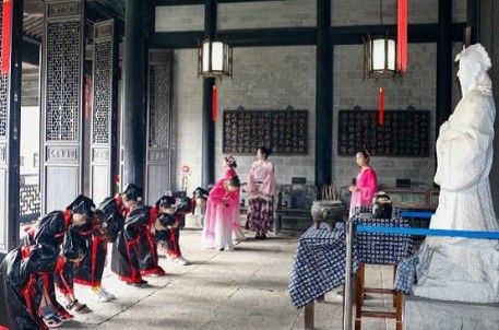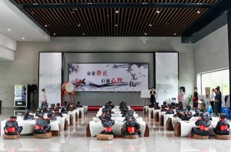 9月10日上午,在蘭亭書法博物館,50名一年級新生身著漢服,在悠揚的編鐘古樂聲中,迎來了他們求學生涯中第一場盛大的開筆禮儀式。整場開筆禮分為正衣冠、凈手靜心、朱砂啟智、擊鼓鳴志、啟蒙立人、誦讀經(jīng)典、師長寄語、敬香朝圣和曲水流觴共9項流程。