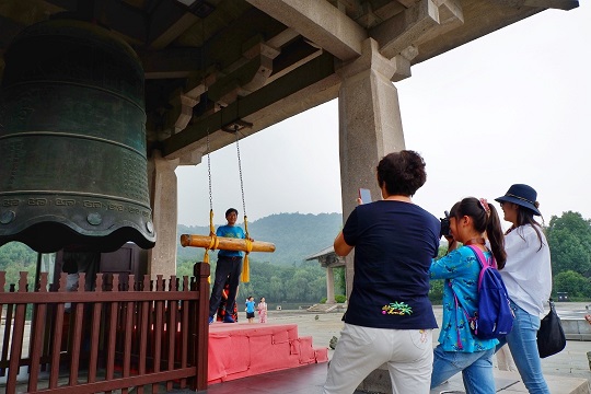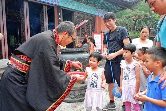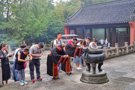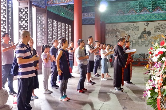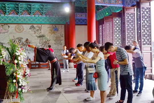 享殿整體氛圍莊嚴肅穆,游客們在兩位祭祀演藝人員的引領下一同體驗祭禹祈福儀式,祈福安康