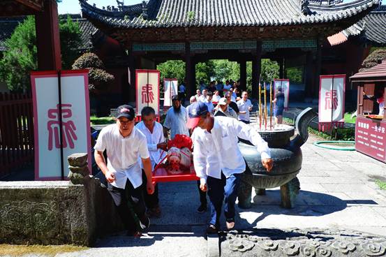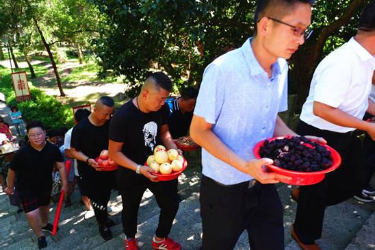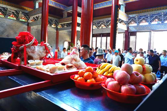 過午門、步臺(tái)階,大禹后裔們抬著三牲、五谷雜糧、水果等祭品,前往禹廟大殿舉行儀式。