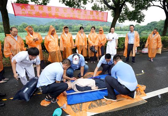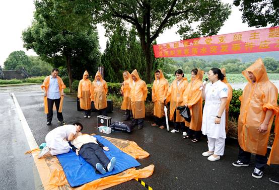 人員搶救。醫(yī)療救護(hù)組到達(dá)事發(fā)現(xiàn)場對(duì)落水者進(jìn)行搶救,將其抬到陰涼處,用人工呼吸、心臟按壓等手段進(jìn)行搶救,同時(shí)等待120急救車的到來。后勤保障組警戒現(xiàn)場,安撫游客情緒。