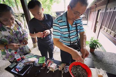 禹陵文創(chuàng)店,人頭攢動。端午期間景區(qū)準(zhǔn)備的各式“粽子”DIY手工包吸引了不少游客,大家紛紛穿針引線,親手縫制“小粽子”,“小香囊”,為家人、朋友祈福,情意滿滿、樂趣十足。