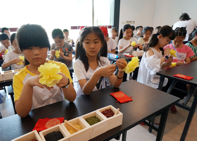 為參與祭禹儀式而動(dòng)手制作小黃花,小朋友們神情莊重,充滿(mǎn)儀式感。