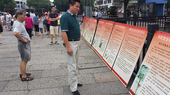 結(jié)合“安全生產(chǎn)月”活動,魯迅故里景區(qū)在主街區(qū)上推出“消防安全知識宣傳系列”展板,上面內(nèi)容都與消防安全有關(guān),比如火災(zāi)發(fā)生時逃生的基本方法、正確使用各類滅火器和濕毛巾防煙等,圖文并茂還配有案例簡析,內(nèi)容非常實用,引得市民和游客朋友駐足旁觀。(楊曄城)