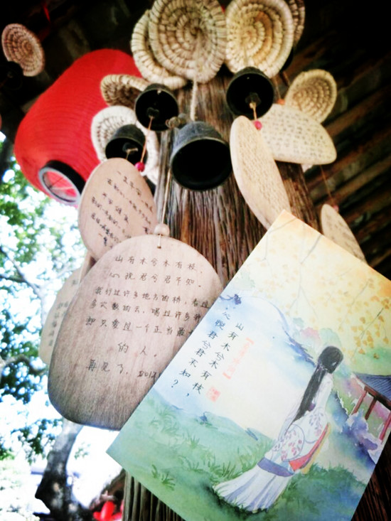 游客們可將愛的宣言和心靈寄語填寫在漂亮的風(fēng)鈴上,懸掛在愛情驛站及長(zhǎng)廊上,著伴隨陣陣鈴聲,引發(fā)諸人縷縷情絲。贈(zèng)送沈園特色的精美賀卡,游客可填寫送給親友。