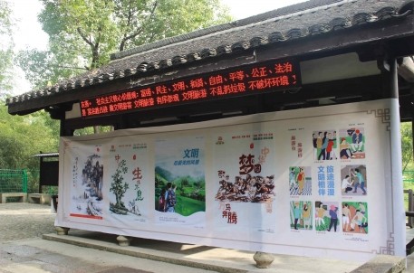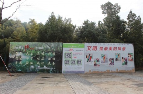 景區(qū)針對文明旅游提示不明顯的問題,制作了兩塊以“社會主義核心價值觀”和“文明旅游”為主要內(nèi)容的大型噴繪,放置于人流量集中的入口廣場;在景區(qū)入口處制作了和景區(qū)建筑氛圍相協(xié)調(diào)的宣傳欄,上墻各類文明城市爭創(chuàng)、社會主義核心價值觀及景區(qū)相關(guān)資訊展板;老售票處現(xiàn)用于產(chǎn)業(yè)租賃,在其裝修期間,為不影響游客參觀,做好印有“文明旅游和社會主義核心價值觀”為主要內(nèi)容的建筑圍擋;同時利用好老售票處LED顯示屏,高頻顯示社會主義核心價值觀和文明旅游提示內(nèi)容,營造良好的文明旅游氛圍。