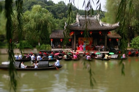 婚慶的船隊(duì),駛出寶珠橋不遠(yuǎn),緩緩返回至碼頭,整齊地排列在水鄉(xiāng)社戲臺下,一場精彩的水上社戲開始了。戲迷朋友們粉墨登場,優(yōu)美動聽的越劇將新人及游客們帶進(jìn)入夢里水鄉(xiāng)。