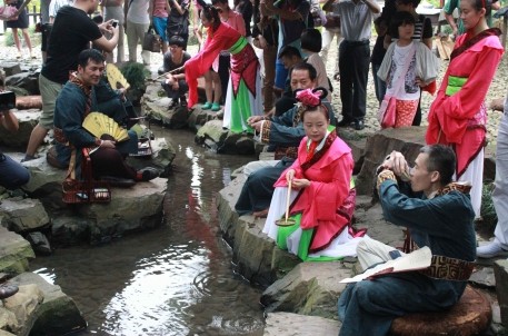交流活動(dòng)結(jié)束之后,一行人來到曲水流觴,當(dāng)年王羲之邀好友臨流泛觴,飲酒賦詩,今日大師們身著古裝,重溫經(jīng)典。揮毫落紙如云煙,筆墨揮灑驚韻味?;顒?dòng)中,大師們紛紛提筆:“石上藝術(shù)蘭亭敘玉,曲水流觴盡顯風(fēng)流”、“同赴蘭亭共舉杯,曲水流觴醉不歸”,篇篇錦繡,字字珠璣,留下詩句,共敘幽情。