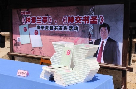 首發(fā)式結(jié)束后,喻革良先生在流觴亭前進行了連續(xù)三天的現(xiàn)場簽名售書活動,吸引了不少對書法或蘭亭感興趣的游客朋友駐足閱讀購買,索要簽名,大家通過喻革良先生的書進一步認(rèn)識蘭亭、品味蘭亭、解讀書圣、了解蘭亭千古傳奇,更充分地感受了蘭亭濃厚的人文氛圍。