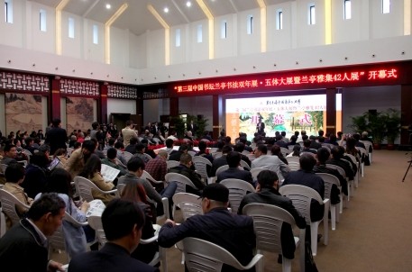 4月1日,在第三十屆中國(guó)蘭亭書法節(jié)期間,《第三屆中國(guó)書壇蘭亭書法雙年展?五體大展暨蘭亭雅集42人展》在紹興博物館盛大開幕。 中共浙江省委宣傳部副部長(zhǎng)黃明輝宣布開幕,浙江省書法家協(xié)會(huì)主席鮑賢倫主持開幕式,中共紹興市委書記錢建民等人致辭,中國(guó)書協(xié)、浙江省領(lǐng)導(dǎo)以及廣大書法愛(ài)好者出席開幕式。