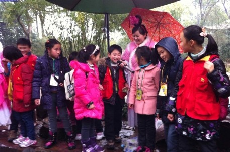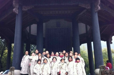 同學(xué)們在帶隊老師的指導(dǎo)下,秩序井然地分組活動,時而追逐歡笑,時而抱團攀談,場面好不熱鬧。在曲水流觴景點現(xiàn)場,同學(xué)們爭先恐后的舉手表演節(jié)目,感受穿越千年的藝術(shù)活動,既能聲情并茂地朗誦《蘭亭集序》又能縱情高歌《爸爸去哪兒》主題曲,展示了自信而又快樂的寒假生活。最后,同學(xué)們還身著書童服在御碑亭前歡快留影。