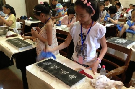 活動中,同學(xué)們在講解員的帶領(lǐng)下先參觀了“蘭亭八景”,與大白鵝合影,在十八缸臨字,之后還饒有興致的參加了書法描紅和仿古的曲水流觴演藝活動,午飯后,還在景區(qū)工作人員的悉心指導(dǎo)下學(xué)習(xí)拓碑技藝。湖州市少年宮一行學(xué)生均有一定的書法基礎(chǔ),對于書法結(jié)構(gòu)、書法基礎(chǔ)知識有一定的掌握和了解,此次來蘭亭景區(qū)實地膜拜,可謂是理論聯(lián)系實踐最有效的結(jié)合。帶領(lǐng)劉老師說‘當(dāng)他提出要帶孩子們出去夏令營時,孩子們不約而同的說要來蘭亭走走看看,可見,《蘭亭序》的書法魅力,蘭亭作為書法圣地的地位已經(jīng)深入每一個書法愛好者的心里。’