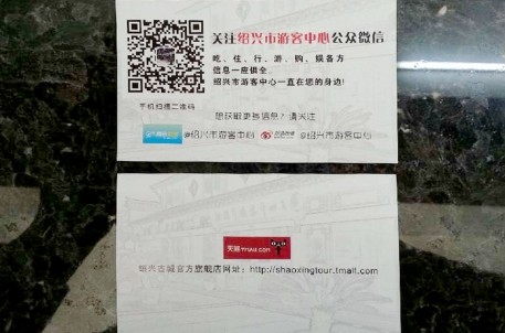 一、制作微信名片。將“紹興市游客中心”微信二維碼印成名片,并附上游客中心新浪微博、騰訊微博賬號(hào),天貓古城旅游旗艦店網(wǎng)址等相關(guān)信息。制成的名片主要投放于游客中心各個(gè)窗口,方便游客取閱、掃描。