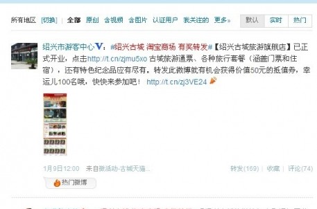 即日起至1月20日止,轉(zhuǎn)發(fā)紹興市游客中心新浪微博即有機(jī)會贏得價(jià)值50元的春節(jié)期間(2月8日至2月14日)“古城自由行套餐”抵用券,共設(shè)有100個(gè)名額?;顒?dòng)剛一推出,便獲得了微博粉絲的熱烈響應(yīng),訪問、轉(zhuǎn)發(fā)率爆增至平時(shí)的幾倍。