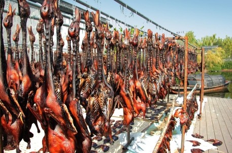 12月23日上午,雖然天氣寒冷,黃酒城后花園池塘邊卻是人聲鼎沸,熱鬧非凡。黃酒城酒樓員工們趁著冬日里難得的晴朗天氣,正在趕制各類醬制品。寒冬臘月,雖然員工們的手大都凍的通紅,但看著一排排制作好的醬貨,臉上都洋溢著笑容。只見醬鴨、魚干、臘腸、醬肉等醬制品一排排整齊的晾曬在池塘邊,成了黃酒城里一道風景,吸引了不少游客后花園里駐足觀看。