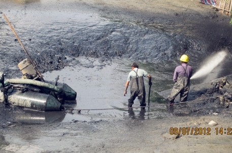 工程按市區(qū)內(nèi)河水系劃分河道先后順序開(kāi)展清淤,做到河道清淤后及時(shí)翻水,減少對(duì)周圍居民的影響。同時(shí),為避免淤泥對(duì)河岸造成二次污染,工程采取了“筑壩抽水、高壓沖泥、泵提泥漿、船舶外運(yùn)”的方法,即用高壓水泵將淤泥從河床底部沖刷起,再用泥漿泵抽送至船舶上,后由運(yùn)泥船直接運(yùn)載至淤泥處置地傾倒。在清淤現(xiàn)場(chǎng),當(dāng)河道內(nèi)的水抽干時(shí),發(fā)現(xiàn)河床兩邊淤泥堆積十分嚴(yán)重,如繆家橋河、汲水弄河基本深度在0.5—0.8米之間,個(gè)別河段如望花河淤泥厚達(dá)2米。