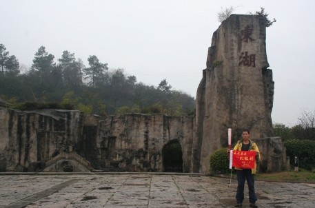 圖為:徒步強人譚家國手執(zhí)奧運火炬在東湖景區(qū)留影