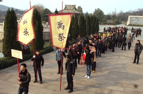新春佳節(jié),時值正月初一,每年一度的姒氏“族祭”在大禹陵內(nèi)舉行,10時許,祭禹廣場齊集以姒氏宗族及河南夏氏、紹興鮑氏、余氏、樓氏代表共三百余人,抬鑼鳴道,懷著對先祖的崇敬與緬懷,列隊(duì)緩緩步入大禹陵。在享殿由大禹第一百四十二代孫、紹興姒族研究會會長姒大牛主持舉行了2012年姒氏祭祖典禮,儀程由獻(xiàn)“三牲”、敬香、告祭組成。隨后,姒族文化研究會、各支系和各姓氏文化研究會都向大禹敬獻(xiàn)了花籃。儀式體現(xiàn)了濃郁的氏族文化和悠遠(yuǎn)的祭禹歷史。
