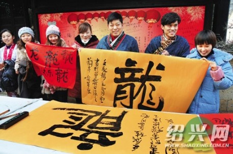 正月初一,蘭亭主區(qū)副主任、紹興知名書家喻革良攜員工和游客一起在流觴亭前潑墨揮毫,書寫“龍”字,喜迎龍年第一天。大幅照片登上了《紹興晚報(bào)》。