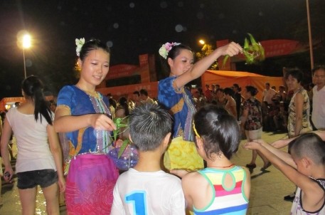當(dāng)晚,稽山園鑒水苑廣場(chǎng),流光溢彩,人頭攢動(dòng)。傣族姑娘向市民潑灑吉祥水,送上了她們夏日最真摯的祝福,也讓市民朋友感受了一番浪漫的傣族風(fēng)情。婀娜多姿的水鄉(xiāng)姑娘們?cè)谝魳穱娙恤骠嫫鹞瑁鴱V場(chǎng)上每一位市民的眼球。激情的舞蹈、涌動(dòng)的噴泉、澎湃的音樂點(diǎn)燃了全場(chǎng)潑水的熱情。整個(gè)潑水狂歡活動(dòng)充滿了歡樂,充滿了笑聲,市民們踴躍參與到水中拔河、背人水戰(zhàn)、男女PK賽等互動(dòng)活動(dòng)中,樂翻了天。他們拿著小臉盆相互追逐、潑水嬉戲、縱情狂歡,盡情享受著清涼水世界的樂趣。最快樂當(dāng)然是孩子們,他們奔跑、嬉笑、潑水,雖然全身濕透了,但快樂卻始終洋溢在他們臉上。